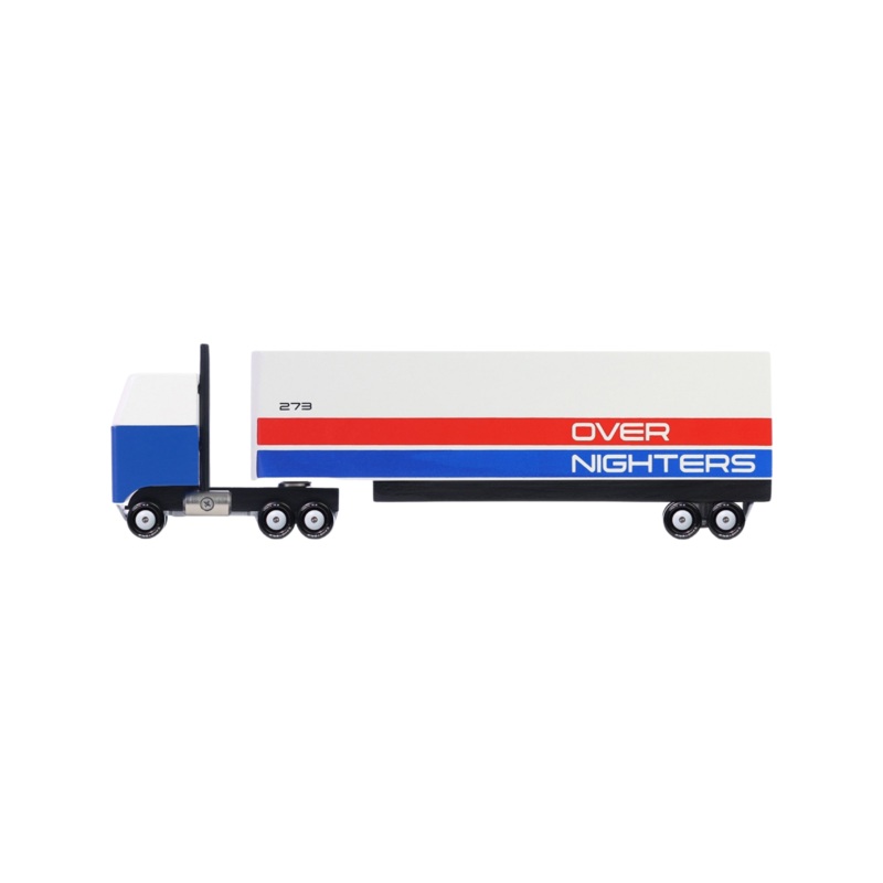 How's my driving? An open trailer with room for one CANDYCAR makes the Overnighters Semi a truck-ton of fun!Materials & Info: Solid Beech Wood, water-based paint and clear urethane coat. Rubber smoke stacks. Metal fuel tanks. ABS plastic wheels.Safety test