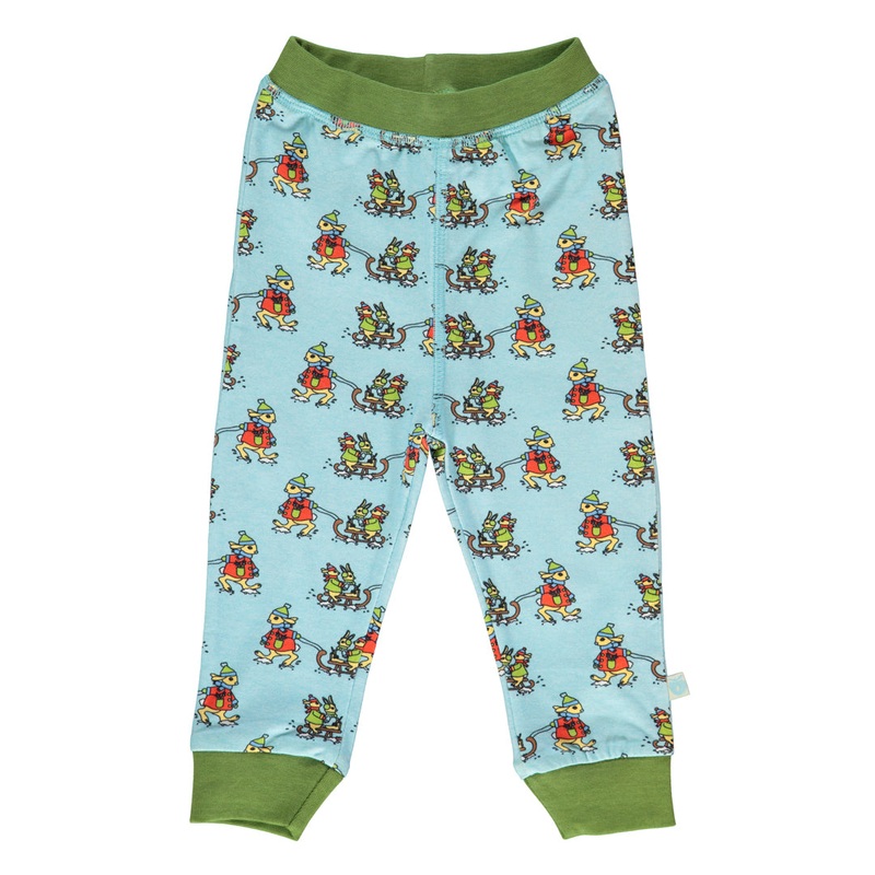 These organic pull-on pants from Smfolk feature an adorable all-over print of rabbits sledding. On a light blue base, these bottoms have coordinating green ribbed elastic at the waistband and ankles for a perfect fit. Smfolk is a Danish-designed brand know