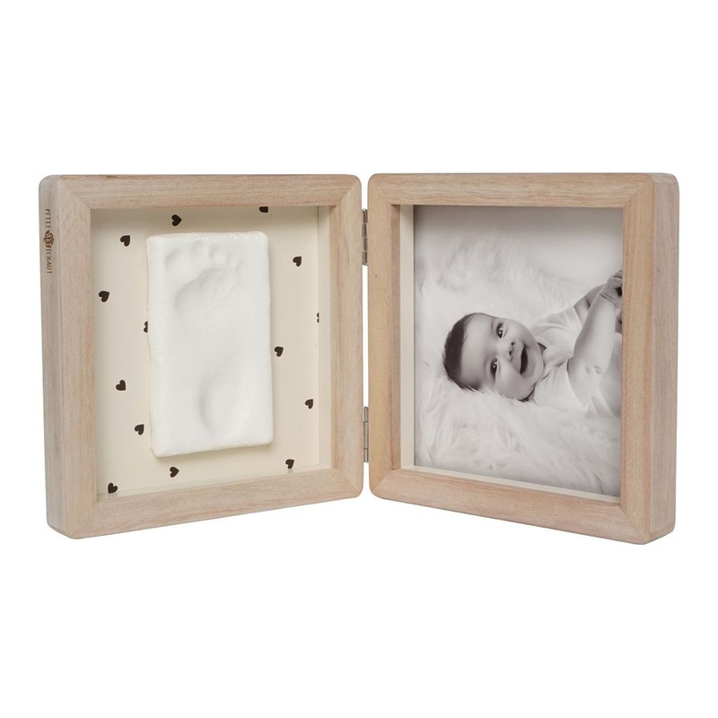 The Petit Artichaut Prettu Hearts Double Frame offers a unique way to display both a photo and a baby imprint. This 2-panel standing frame combines a photo on one side with an imprint on the other. Choose your favorite design by using the reversible beige background with or without heart patterns. The kit includes hypoallergenic clay, a roller, and instructions to easily create the imprint.
