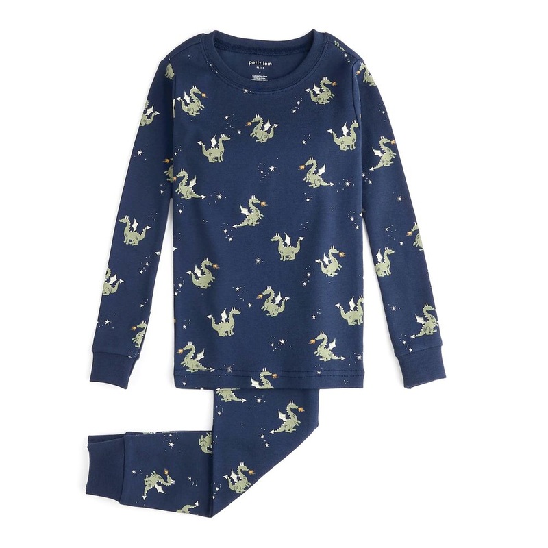 Petit Lem 2-Piece Organic Cotton Ribbed Pajama Set in Dragon Print on Navy Blue