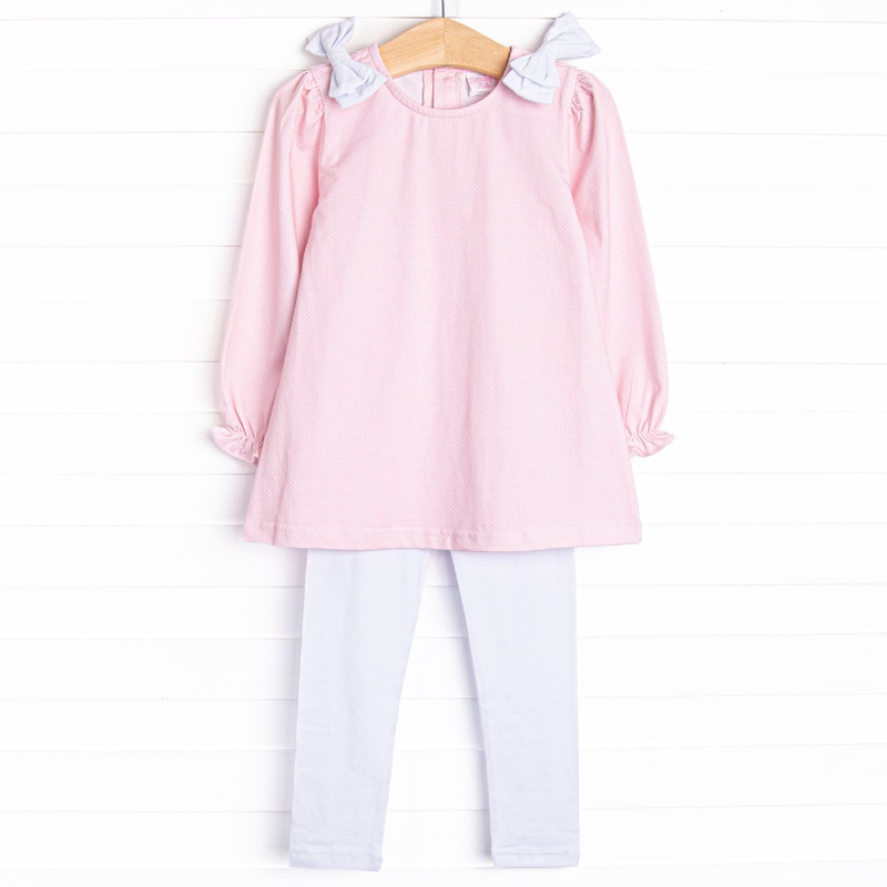 Petite Pink Polka Dots! This set features a pink polka dot top with white bows and white leggings to match. This is the sweetest set!