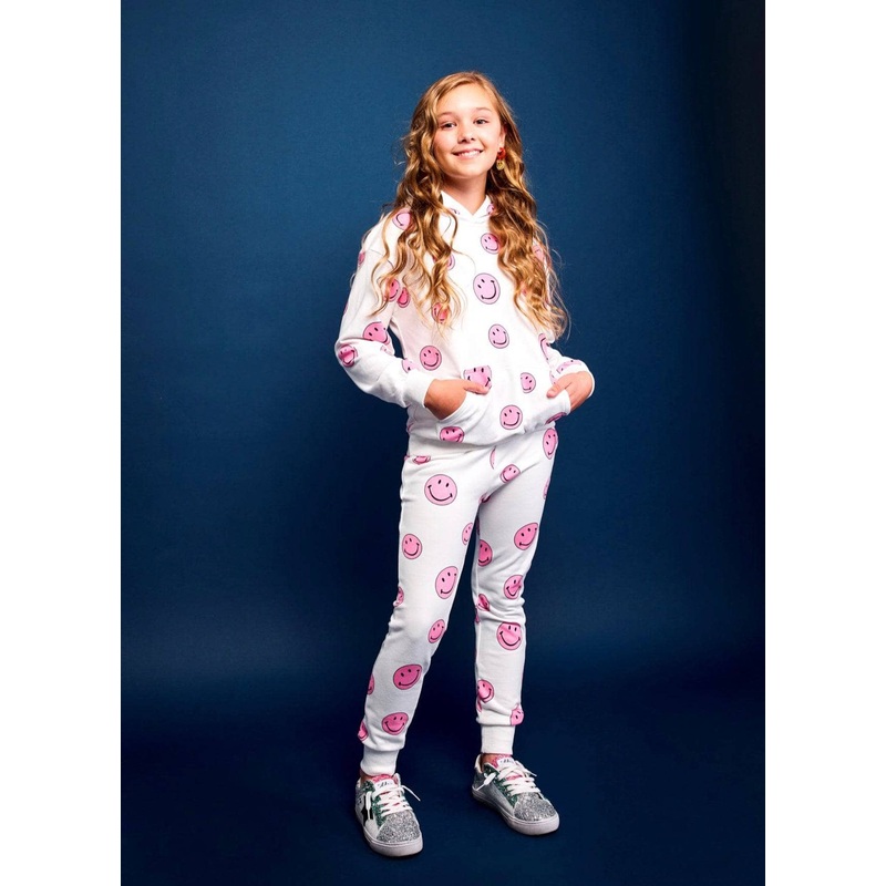• Fun and playful joggers featuring an all-over pink smiley emoji print on a crisp white background.