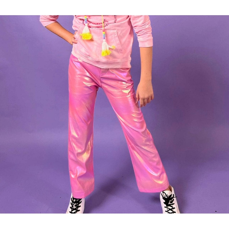 - Eye-catching holographic pants in a vibrant pink hue, designed to shimmer and shine with every move.