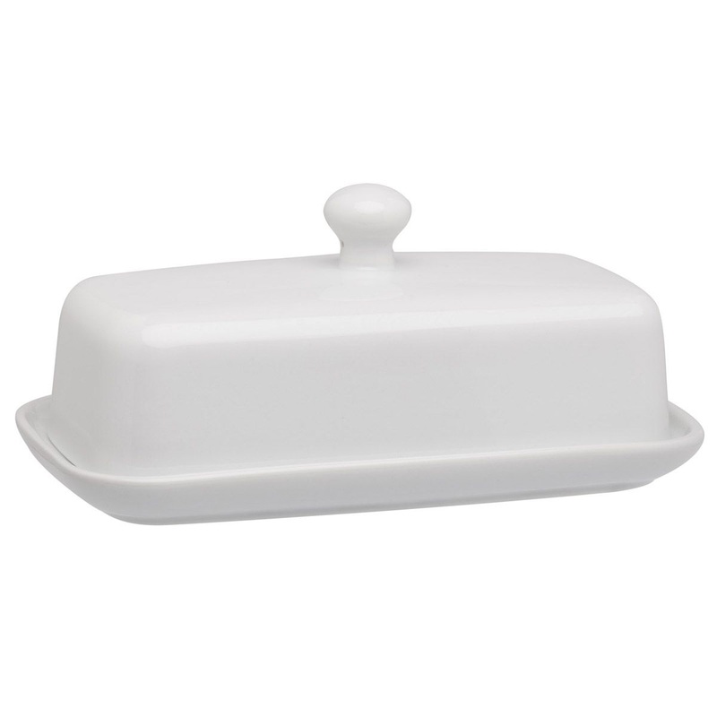 Serve butter in style, whether at your breakfast table or the annual holiday dinner. The Porcelain Butter Dish 79404 works perfectly for both east-coast Elgin-style and west-coast stubby sticks of butters. Classic white design to complement any table setti
