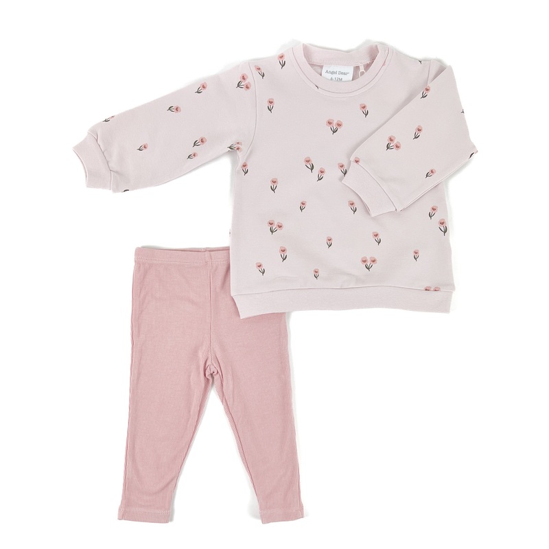 Nothing says cozy more than this adorable Angel Dear getup! Rock a pink floral terry sweatshirt and super stylish pink ribbed leggingstogether, they make for a pretty fabulous look!95% organic cotton, 5% spandex. Machine wash gentle cycle, tumble dry low.