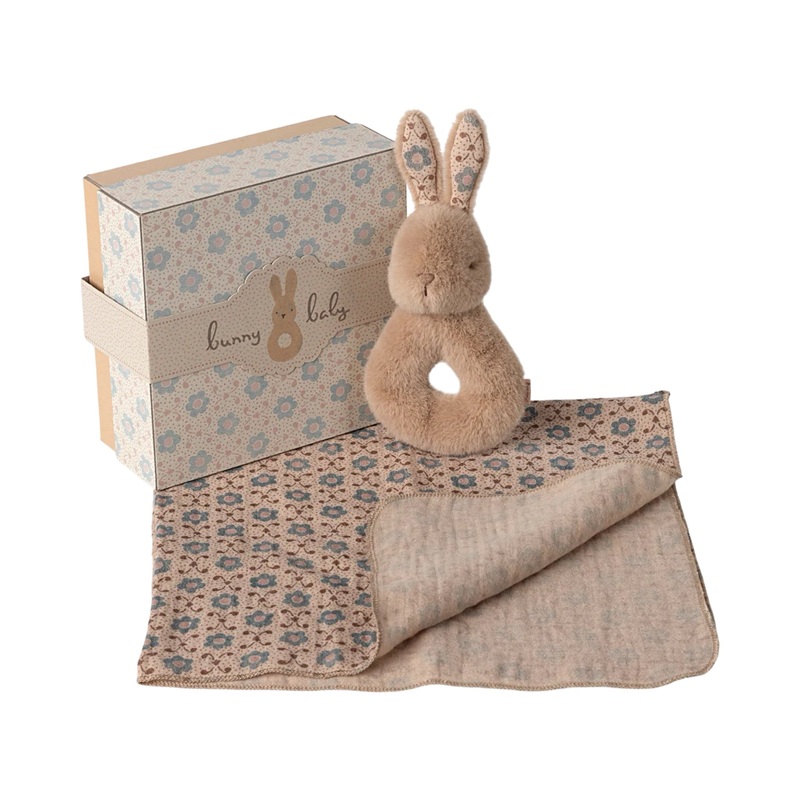 A perfect gift idea for the little ones. The set includes a soft cotton cloth and a small rabbit rattle. The rabbit has a small rattle inside that makes a soft sound. It all comes in a beautiful gift box.