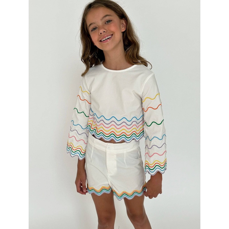 Description:A chic two-piece set featuring colorful wave patterns for a vibrant, eye-catching look.The cropped top boasts flared sleeves for added flair, while the matching shorts provide a tailored finish.Perfect for playful summer outings or stylish casu