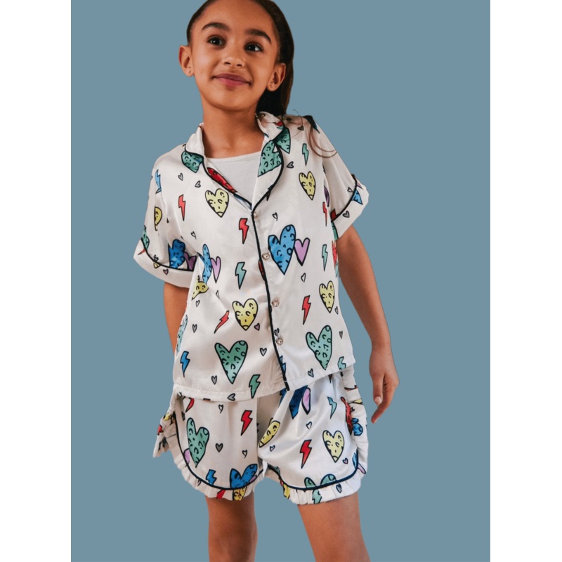 Description:Fun and vibrant short set featuring a playful print of rainbow cheetah hearts.Includes a button-up short-sleeve top and matching ruffle shorts.Top features a classic notched collar and elegant contrast piping.Shorts have an elastic waistband fo
