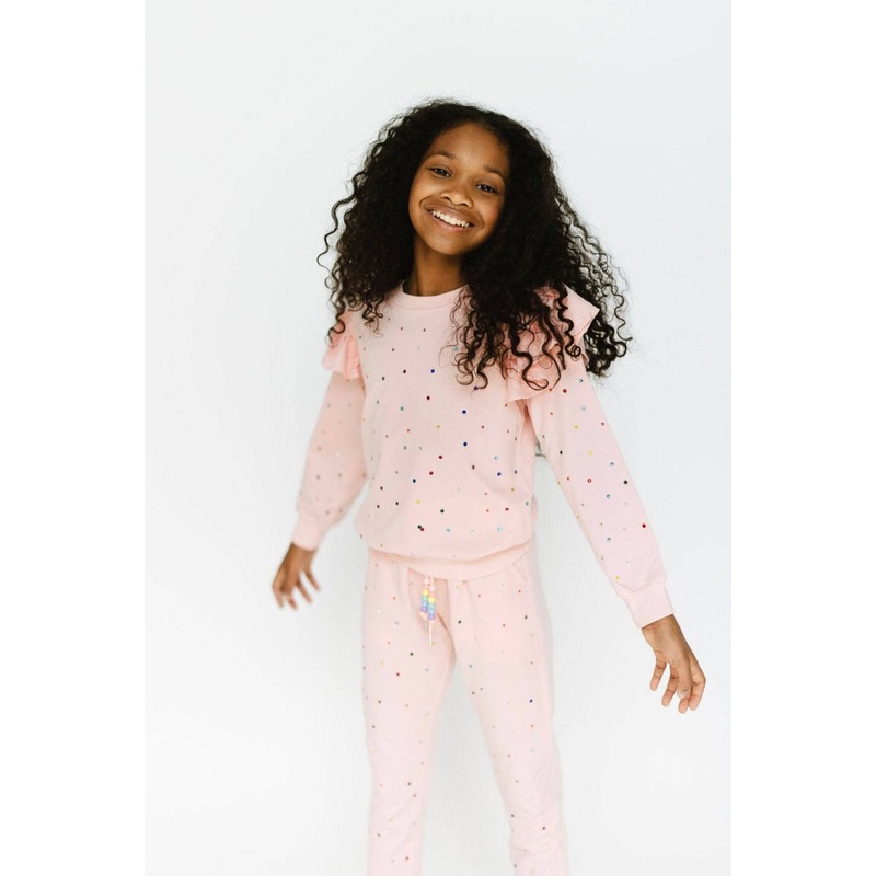 Description:Adorable jogger set featuring a pink sweatshirt and matching pants adorned with rainbow crystal embellishments, perfect for adding a touch of sparkle to any outfit.Designed with stylish ruffles on the shoulders and a comfortable fit, ideal for