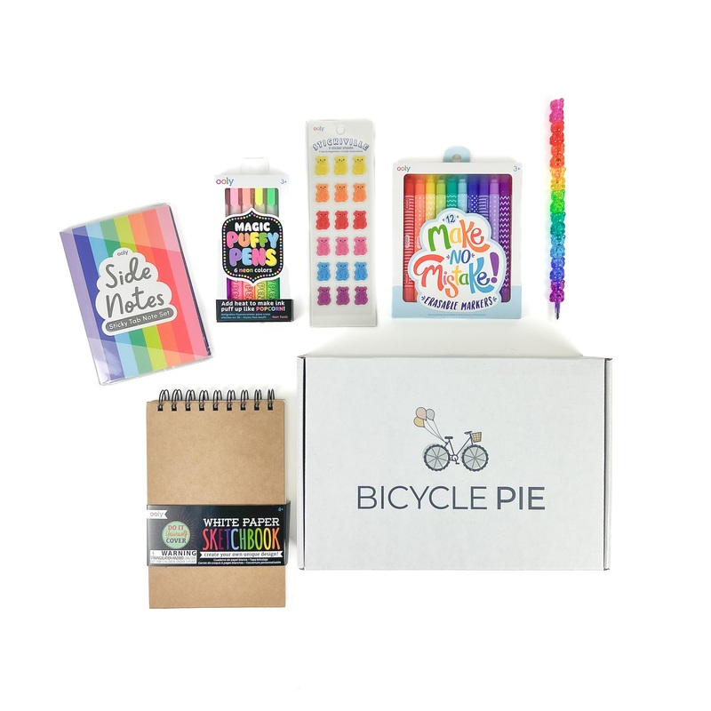 Older kiddos will love this colorful gummy bear-inspired gift bundle, perfect for doodlers, sketchers, drawers and artists. This set includes:Side Notes Sticky Tab Note PadMagic Neon Puffy Pens SetsStickiville Gummy Bear StickersMake No Mistake Erasable Ma