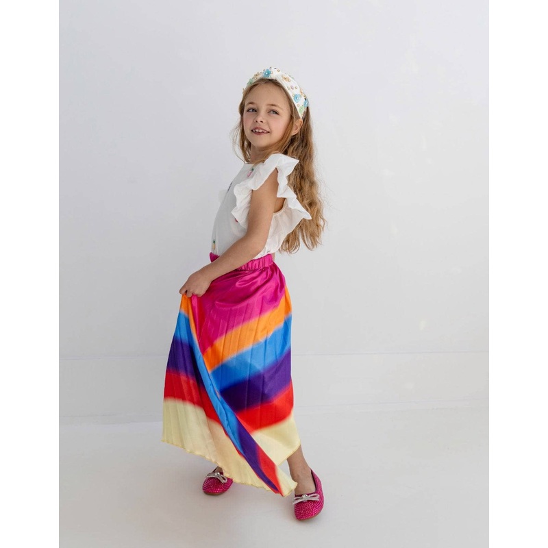 - Make a bold statement with this vibrant rainbow pleated midi skirt.