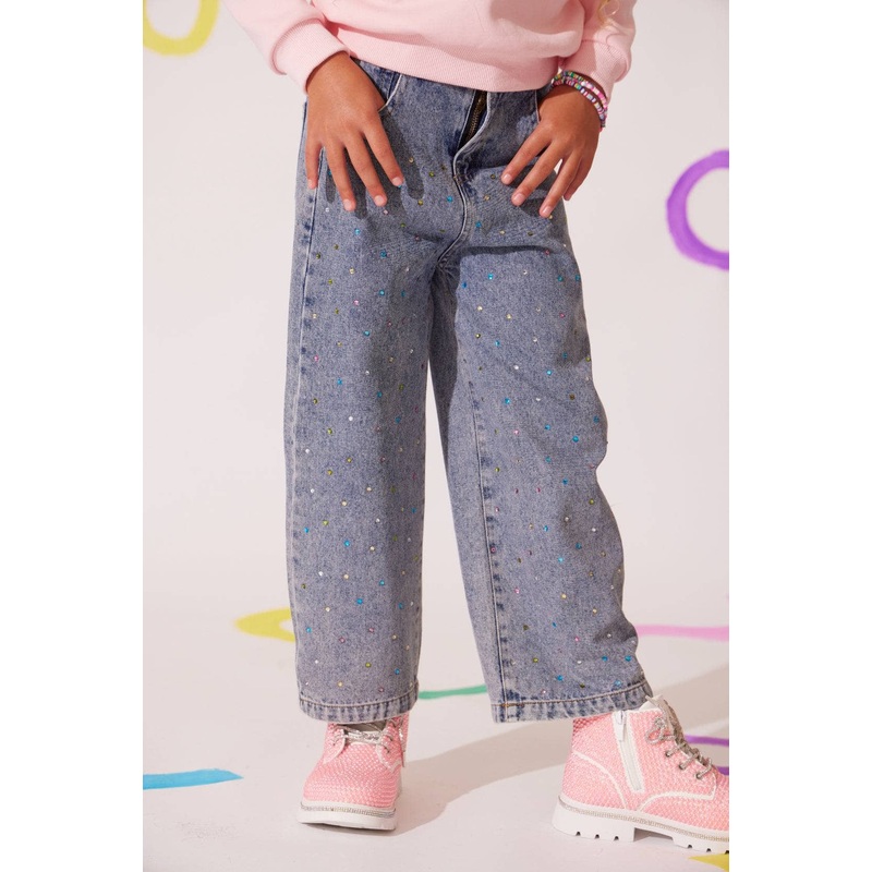 Description:Trendy denim jeans embellished with rainbow-colored sparkles for a fun and vibrant look.Classic high-waist design with a relaxed fit and wide legs.Front and back pockets for added functionality and style.Perfect for adding a pop of color and sp