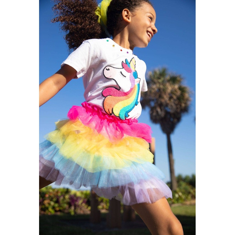 - Bright and playful rainbow tutu skirt with layered tulle in vibrant shades for a magical, multi-dimensional look.