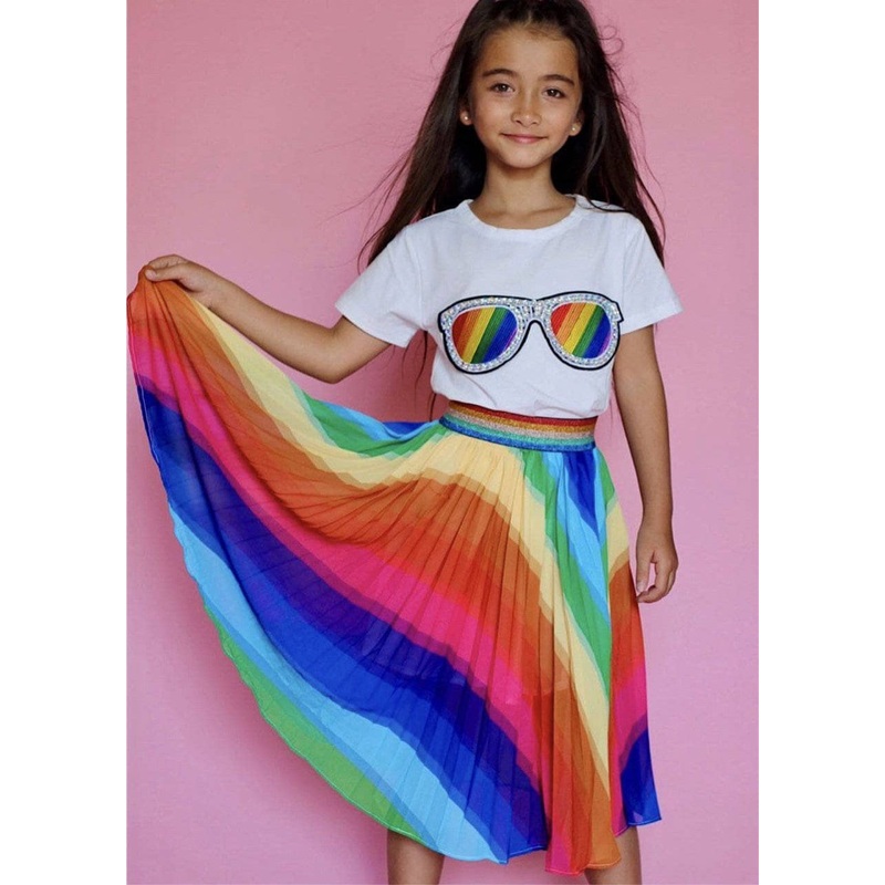 Description:A vibrant pleated midi skirt with a rainbow design that adds a playful, colorful flair to any wardrobe.Features a comfortable elastic waistband with a glittery detail for a secure fit and extra sparkle.Perfect for twirling at parties, celebrati