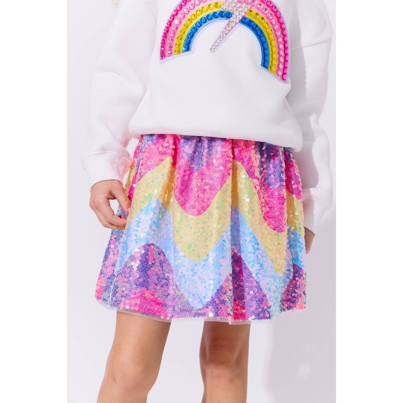 Description:Sparkle in this dazzling rainbow wave sequin skirt, designed for a fun and vibrant statement lookFeatures an elastic silver waistband with cut-out heart details for a stylish and comfortable fitLayered tulle lining adds volume, making it perfec