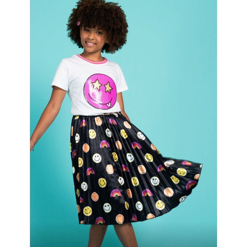 - Brighten up any outfit with the Rainbows And Emoji Satin Skirt, featuring a playful pattern of colorful emojis and rainbows.