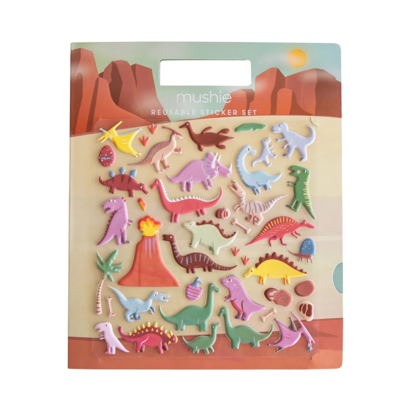 Set the stage for imaginative storytelling with a reusablestickerbook that features dinosaur themes and prehistoric scenes. With puffy stickers that can be used over and over again, kids will enjoy pretend play with a variety of colorful dinosaurs. The simple carrying handles let you take playtime anywhere with easy-to-hold cutouts at the top of the book. Watch littlesact out countless scenarios as they move stickers around the book and explore.