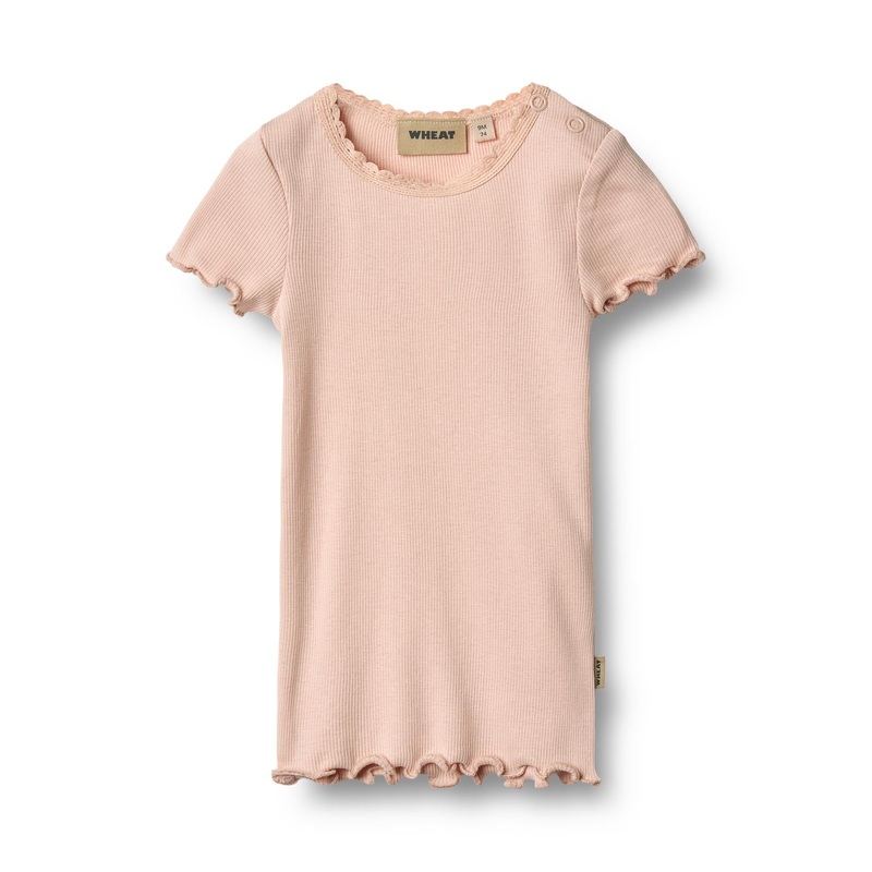 Short-sleeved rib T-shirt in a soft mix of organic cotton and Lenzing modal for babies. - Fitted and stretchable - Lace details at neckline - Overlocked edges at the sleeves and bottom hem - Press buttons at the shoulder - Ribbed structure Wheat's T-shirts