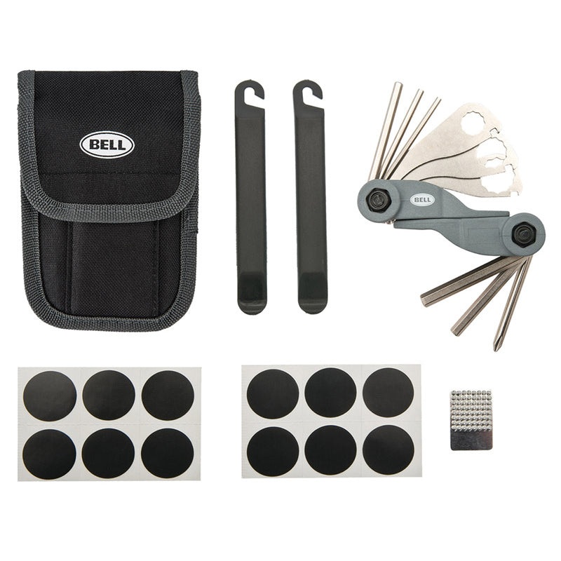 Set includes: 2.5, 3, 4, 5 and 6 mm Allen wrenches, 8, 9, 10, 12 and 14 mm box end wrenches, 14, 15 and 16 gauge spoke wrenches, Phillips and flathead screwdriver, two tire levers with tire deflators. Also includes an inner tube repair kit with 12 patches.