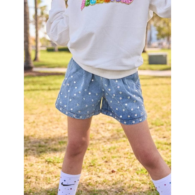 - Add an edge to your style with this denim shorts, featuring eye-catching crystal embellishments throughout.