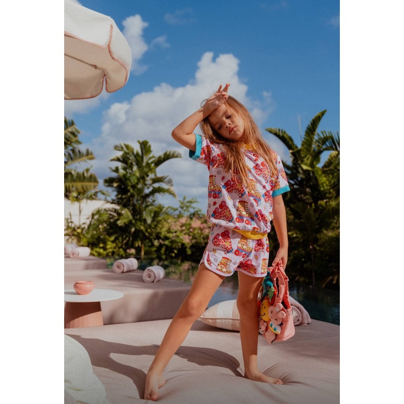 - Fun and vibrant short set featuring an all-over roller skate print with playful smiley faces, lightning bolts, and stars.