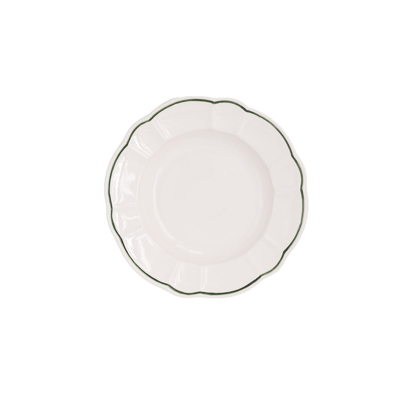 English Cookbook author Skye McAlpine brings her lifelong love of Venetian craft and a dash of British chintz to Tavola, her collection of essential tabletop pieces. Inspiring you to share your table with others, these are pieces that make such endeavors aseffortless as they are appealing. The Romilly series is aclassic white plate with a softly scalloped edge and hand-painted trim. The Romilly Pasta Dish in Green, Set of 4is ideal for serving your favoritenoodles and grains,at the dining room tableor al fresco.