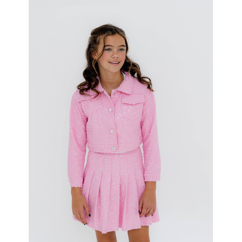 Description:Elevate her style with the Rosie Shimmer Denim Set.Features a button-down denim top with a collar and sparkly details.Coordinated pleated skirt adds a touch of elegance and charm.Perfect for both casual outings and special occasions.Material &