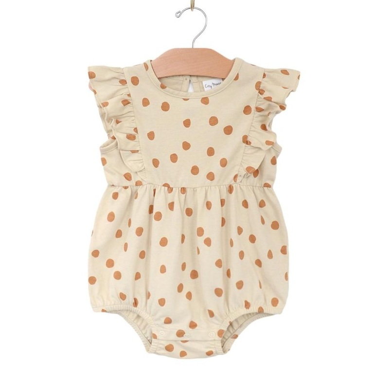 Everyone's favorite flutter-sleeve short romper in 100% cotton combed jersey gets an update in saffron dots print, just in time for the warmer weather! The perfect spring romper with flutters at the shoulders and snaps at the bottom for easy changing.