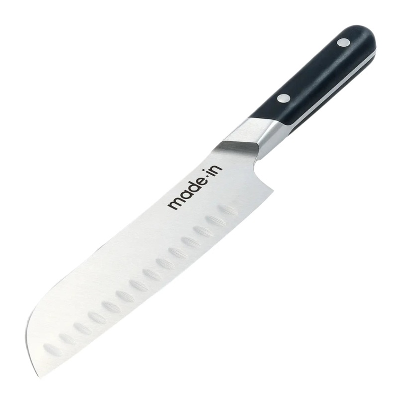 Born out of a 100-year old, family-owned restaurant supply business, Made In brings restaurant-quality, performance kitchenware to home cooks around the world. The brand sources the highest quality raw materials and designs products to the exacting standards of the worlds best chefs. The Santoku Knifea multi-talented kitchen tool that fills a gap in any cutlery arsenal. Hand scalloped to reduce friction and stickage, crafted from premium nitrogen-treated X50CrMoV15 stainless steel, and fully forged just like our best-selling Chef Knife, our Santoku Knife will bolster the virtuousness of your knife block.