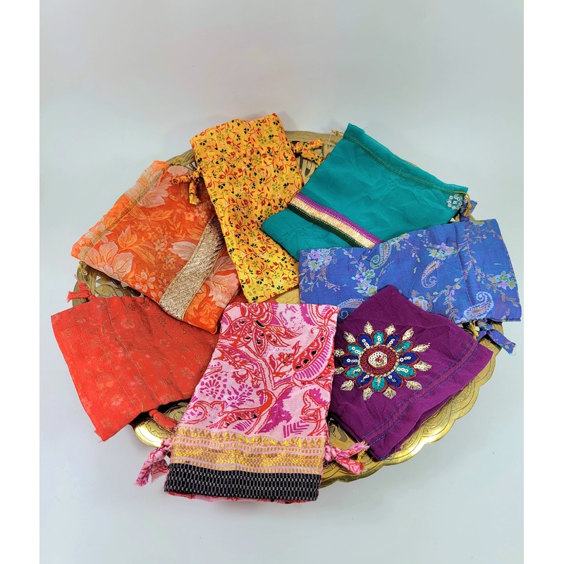 Sustainably sourced storage or the giftbag that keeps on giving: the possibilities for these unique and colorful drawstring fabric bags are endless! Handmade with recycled saris (traditional woven fabric garments worn by women in the Indian subcontinent) by vulnerable and rescued women in Nepal, these bags measure between 4″ – 7″ long and 3.5″ – 4.5″ wide (laid flat). Their size, colors, and patterns do vary, however, due to the nature of the material and construction, but that also makes them truly one-of-a-kind. Provide healing and a sustainable future for women in Nepal and our planet by purchasing sari drawstring bags today!