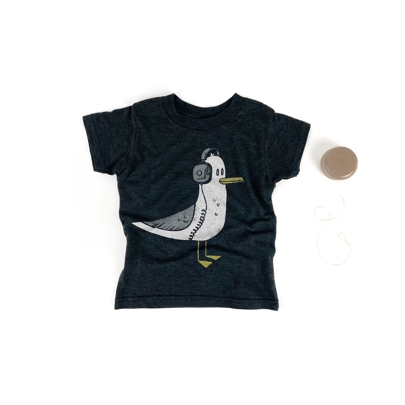 Little ones (and parents, too!) will love the fresh look of the seagull on the front of this charcoal black super soft triblend kids tee. All of Factory 43s shirts feature original illustrations from Seattles Andrew Saeger and Veronica Velasco, graphics that we think are a perfect blend of modern cool and vintage cute.