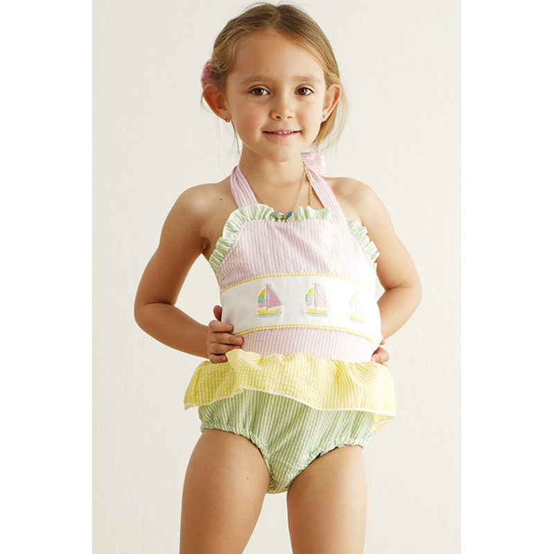 Set sail in style with our seersucker sailboat embroidered swimsuit for girls. Perfect for a day at the beach or pool, this suit is a fun and playful addition to any summer wardrobe. Made with comfortable and stylish seersucker fabric, your little one will be ready to make a splash!
