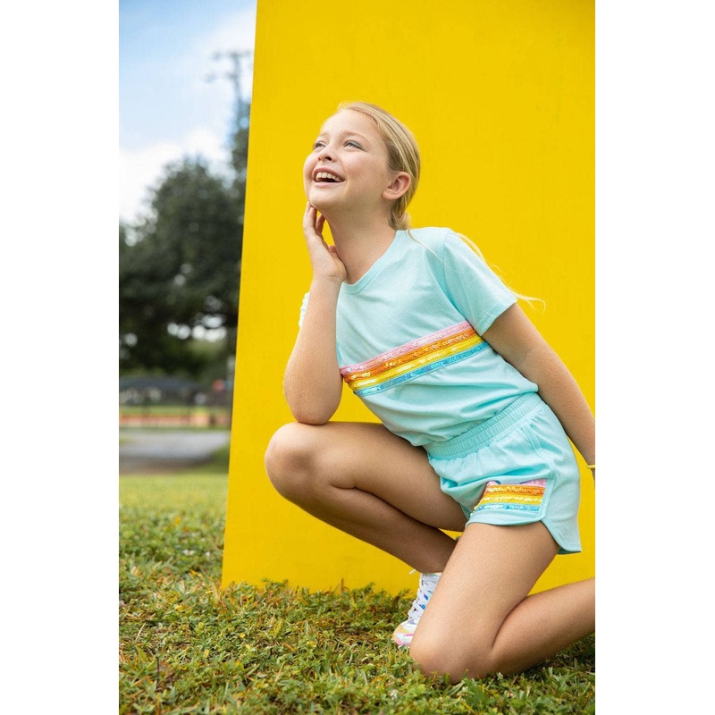 Description:Stylish two-piece set featuring a pastel aqua base with vibrant rainbow sequin stripes for a playful pop of color.Includes a short-sleeve tee and elastic waist shorts designed for comfort and easy movement.Perfect for casual outings, summer fun