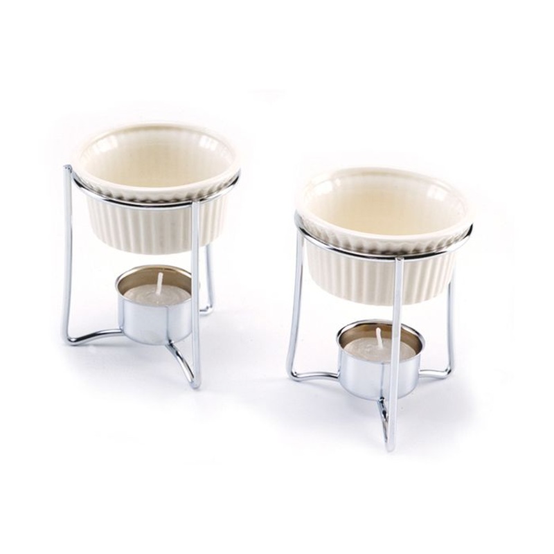 Designed to keep specialty sauces and dips warm in the serving line, the Set of 2 Butter Warmers 215 from Norpro Kitchenware are easy to use and easy to clean! Ceramic dishes maintain an even heat; doesn't scorch or curdle contents. 2 Stainless Steel Holde