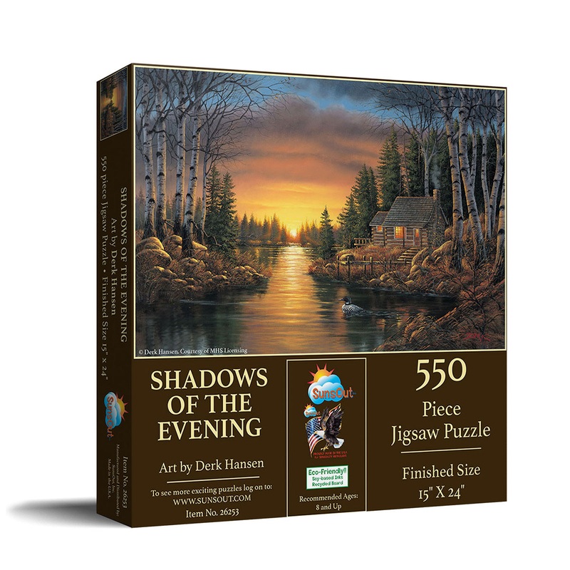 This Shadows of the Evening 550 PC Puzzle can provide hours of fun for you and your loved ones as you assemble this beautiful scene. It features a colorful sunset lighting up the sky over a wooded cabin beside a lake with a lone loon swimming.550 piecesPro