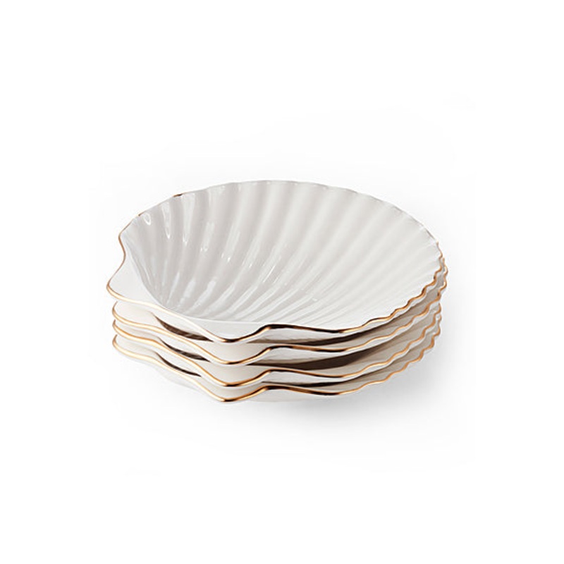 Bring coastal design and character to a table setting with this set of four appetizer plates inspired by a scallop shell. Gold edging adds a sophisticated touch.