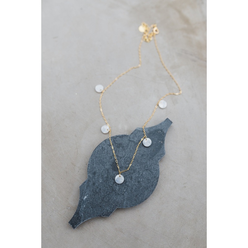 The Shell Essence Necklace entails a delicate gold-plated chain with creamy acrylic acetate charms spaced throughout an 18″ chain with a 2″ extender. Enjoy this simple layering necklace that is apart of our Sea Breeze Collection! Made by at-risk women apart of our Encompassed Creations program right here in Michigan. Shop with a purchase!