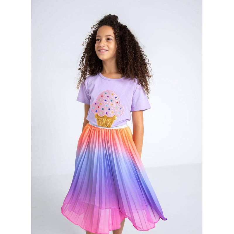 - Elegant pleated skirt featuring a dreamy sherbet ombre design with gradient hues.