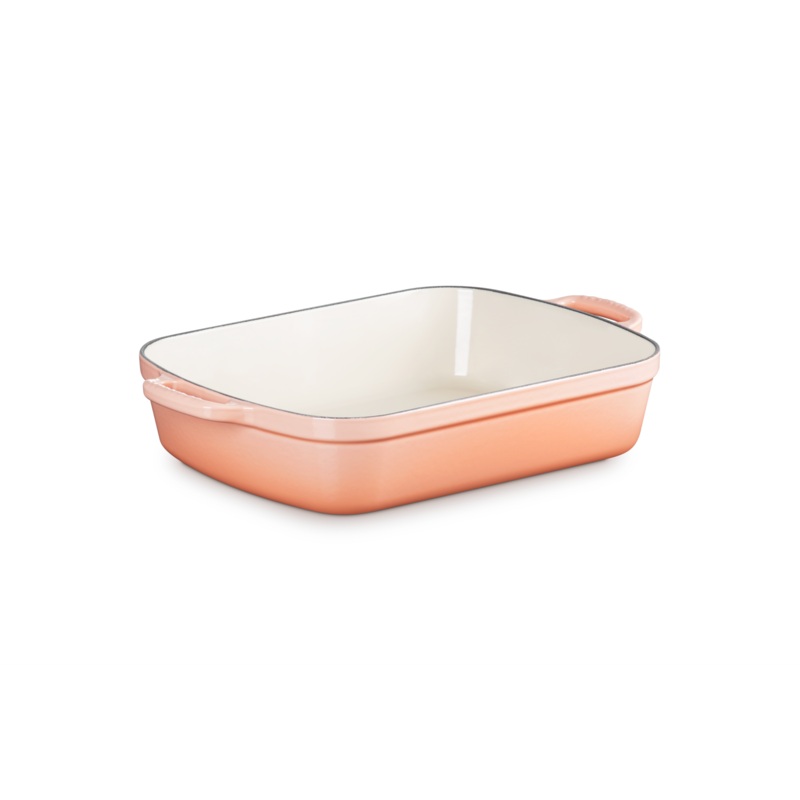 Recognized for its strength and durability, as well as its beauty and quality, Le Creuset produced the first enameled cast iron cookware nearly a century ago. A tradition of maintaining the finest culinary craftsmanship, combined with the latest innovations, means Le Creuset is made for home cooks and professional chefs alike. The Signature Rectangular Roaster in Peche is ideal for oven-roasted chicken breasts, homemade lasagna, casseroles, and side dishes.