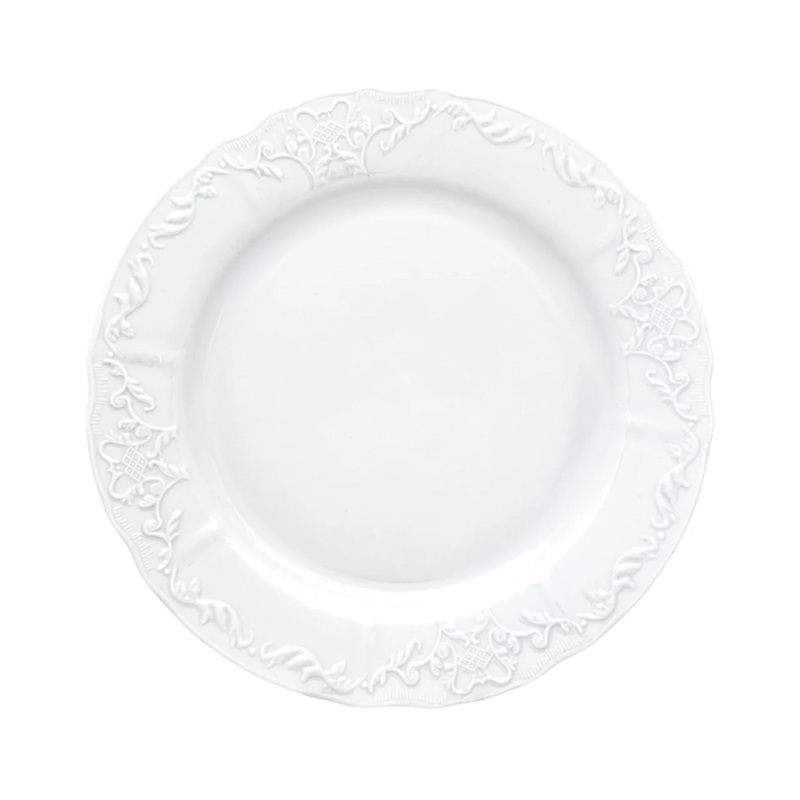 Inspired by 18th Century botanical illustrators, Hungarian designer Anna Weatherley creates hand-painted porcelain pieces to adorn the home, from dinnerware to stunning tablescapes. Decorated with a traditional embossed French relief pattern, the Simply Anna Charger in White is an ideally elegant choice asa base late for serving in both casual and more formal settings.