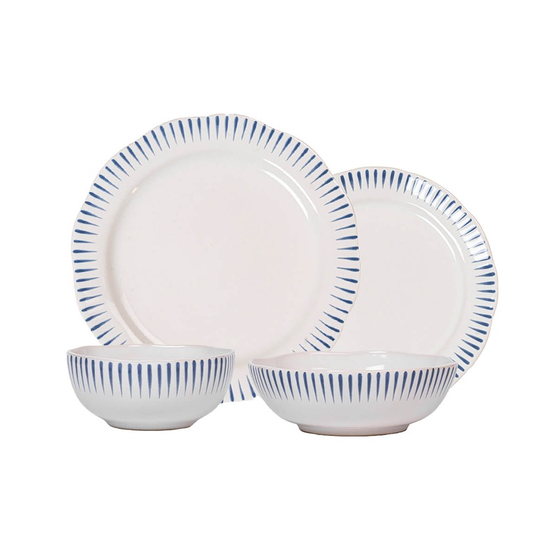 As newlyweds and self-proclaimed romantics, Capucine and David Gooding founded Juliska in 2001 with a small collection of mouth-blown glasses. Today, its the tableware and home brand every good hostess needs to know.Inspired by the idyllic town of Sitio, Portugal, comes a fresh and relaxed pattern that puts an artistic exclamation point on everything within its frame of radiating stripes in Delft Blue. This set includes a dinner plate, dessert/salad plate, cereal/ice cream bowl and a coupe pasta bowl.