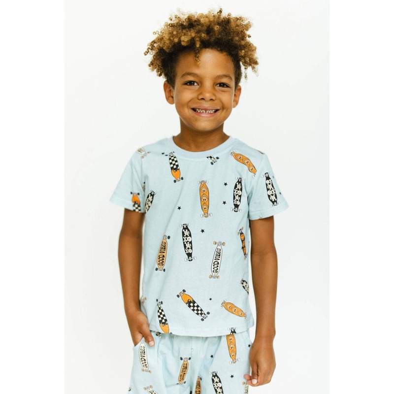 - Hit the streets in style with this set featuring a playful all-over skateboard print.