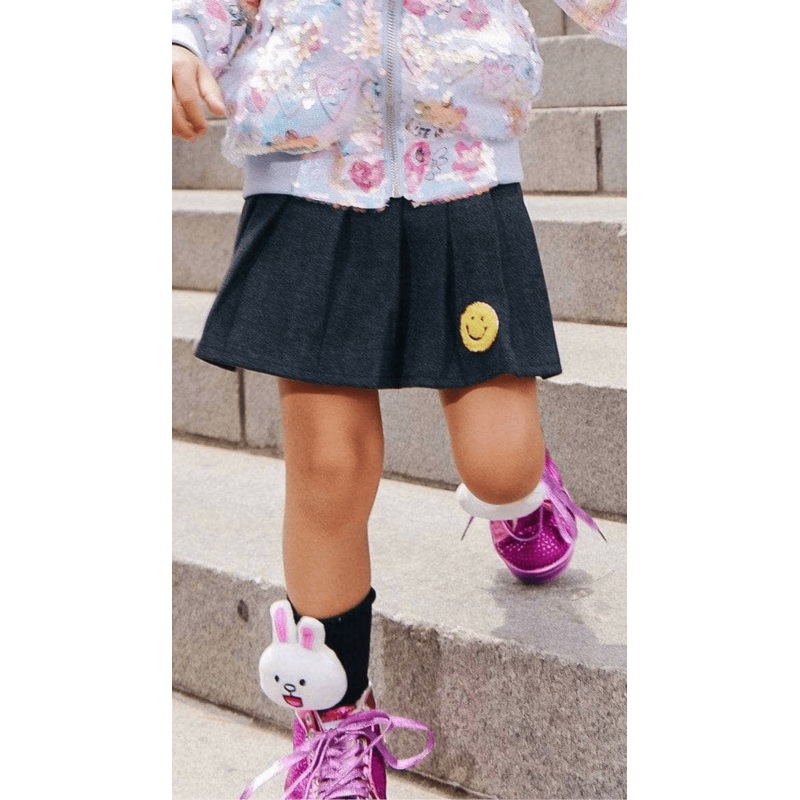 • Stylish black pleated tennis skirt with a sparkling crystal smiley face accent for a fun, playful vibe