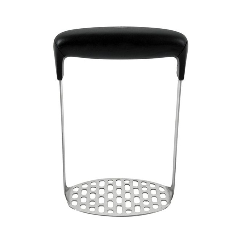 The Smooth Potato Masher 34581 is powerful yet comfortable even when mashing large amounts of potatoes. Features a broad, soft, horizontal handle which lets you press straight down as it absorbs pressure. A fine-grid, stainless steel mashing plate yields s