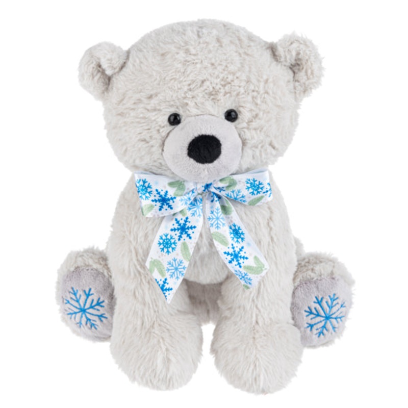 Snowflake loves snowy winters but is anything but cold. This soft and cuddly bear will warm your heart. It features super soft white fur, blue embroidered snowflakes on its feet, and a satin snowflake print ribbon.