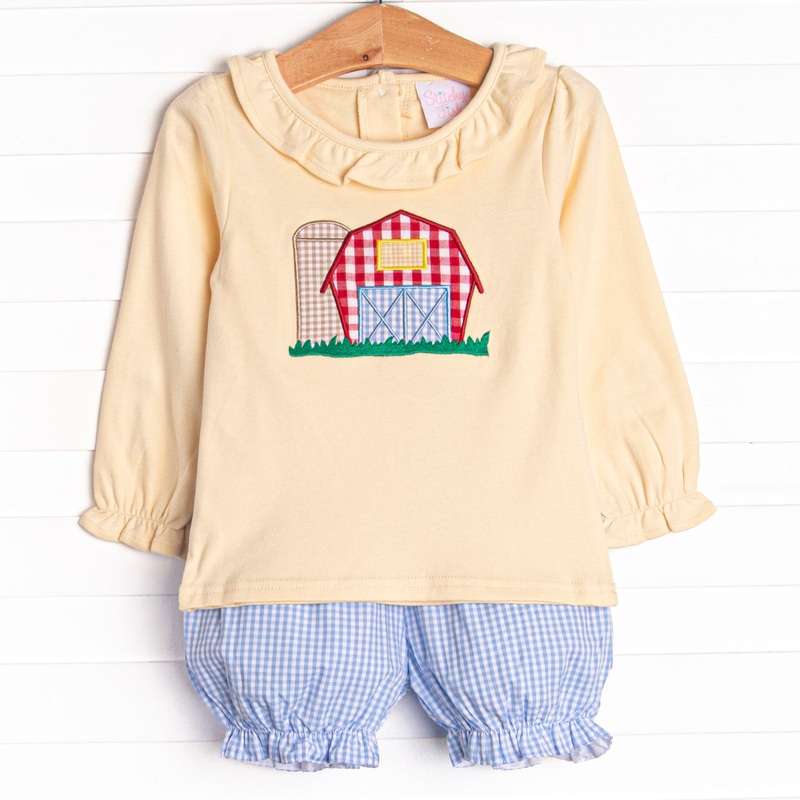 The Sweetest Southern Silo! This set features a yellow long sleeve top with a ruffle collar and a farm applique. Coordinating blue gingham bloomer shorts to match. She will be the Belle of the Barn in this set!