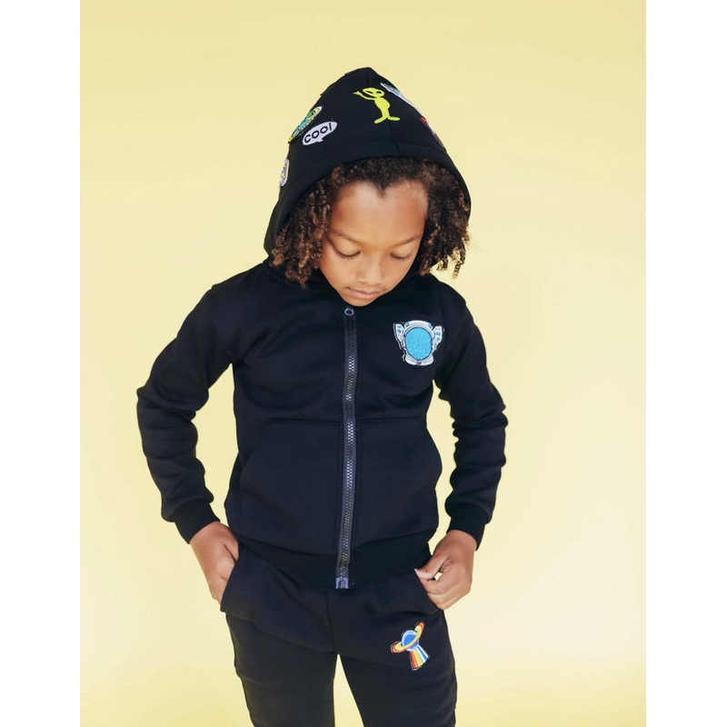 Description:Out-of-this-world jogger set featuring colorful space-themed patches on the hoodie and joggers.Includes a zip-up hoodie with a lined hood and matching joggers with an elastic waistband for all-day comfort.Perfect for active days, casual outings
