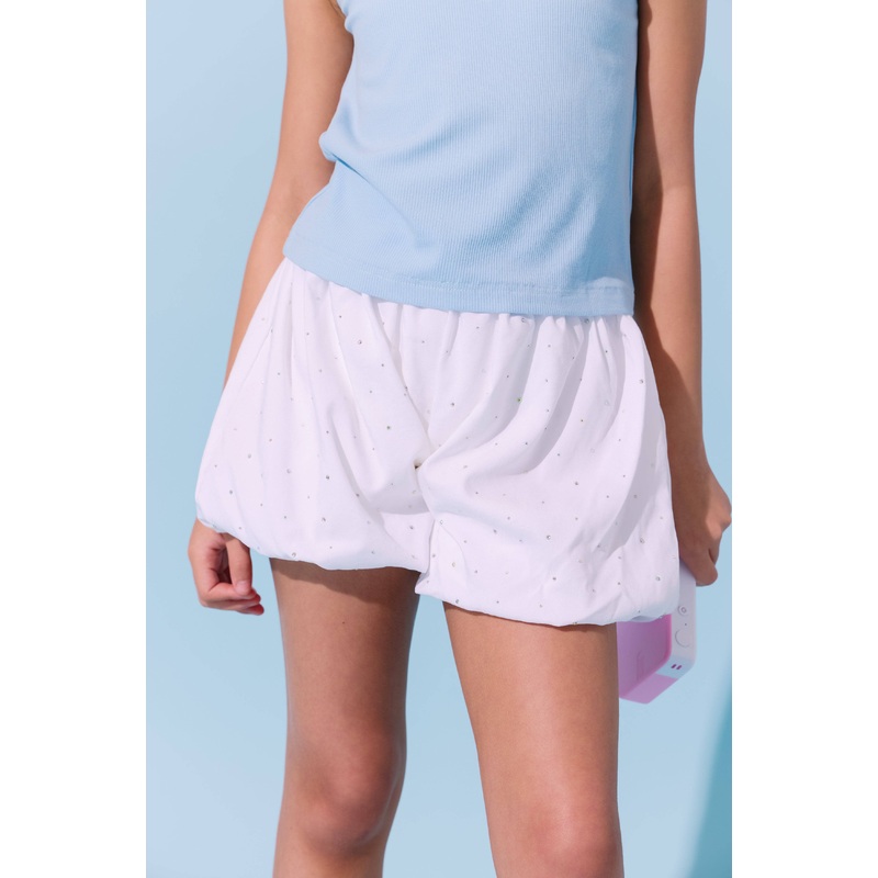 - Eye-catching bubble skort embellished with scattered sparkling crystals for a touch of glam.