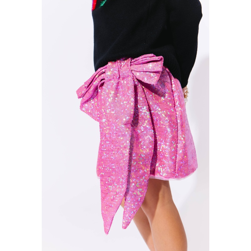 - Dazzle and shine with the Sparkling Pink Sequin Bow Skirt, a charming addition to any festive wardrobe.