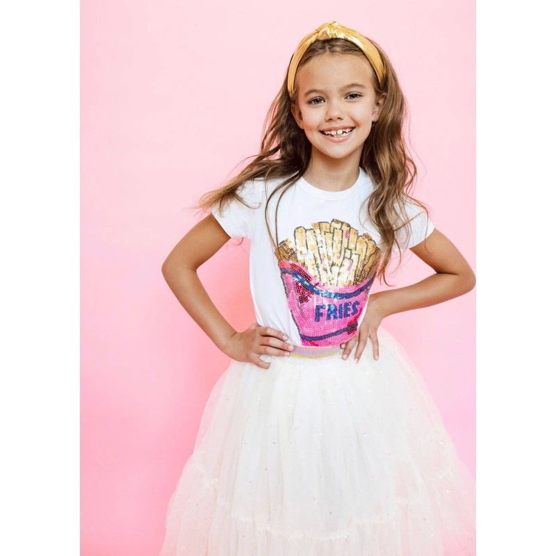 Description:Elegant ivory midi skirt with a layered tulle design, adorned with sparkling star details for a magical, ethereal look.Features a glittery elastic waistband for a comfortable fit and a hint of shimmer.Perfect for special occasions, parties, or